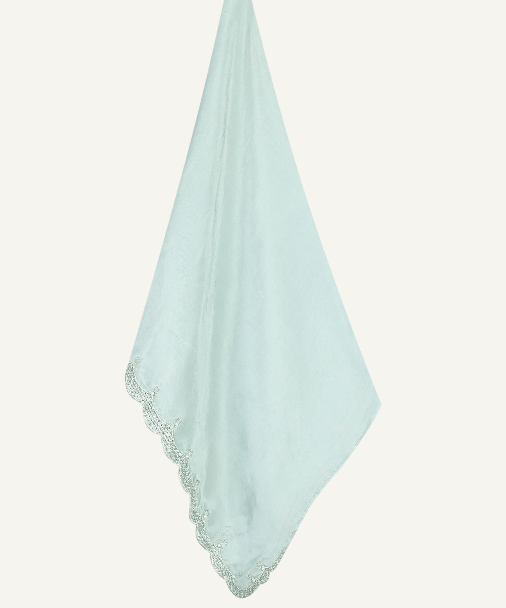 The Pastel Green Satin Fancy Embroidered Hijab, crafted from soft satin fabric that drapes gracefully with a rich sheen, showcases embroidered borders with handcrafted embellishments, making it perfect for weddings and festive occasions.