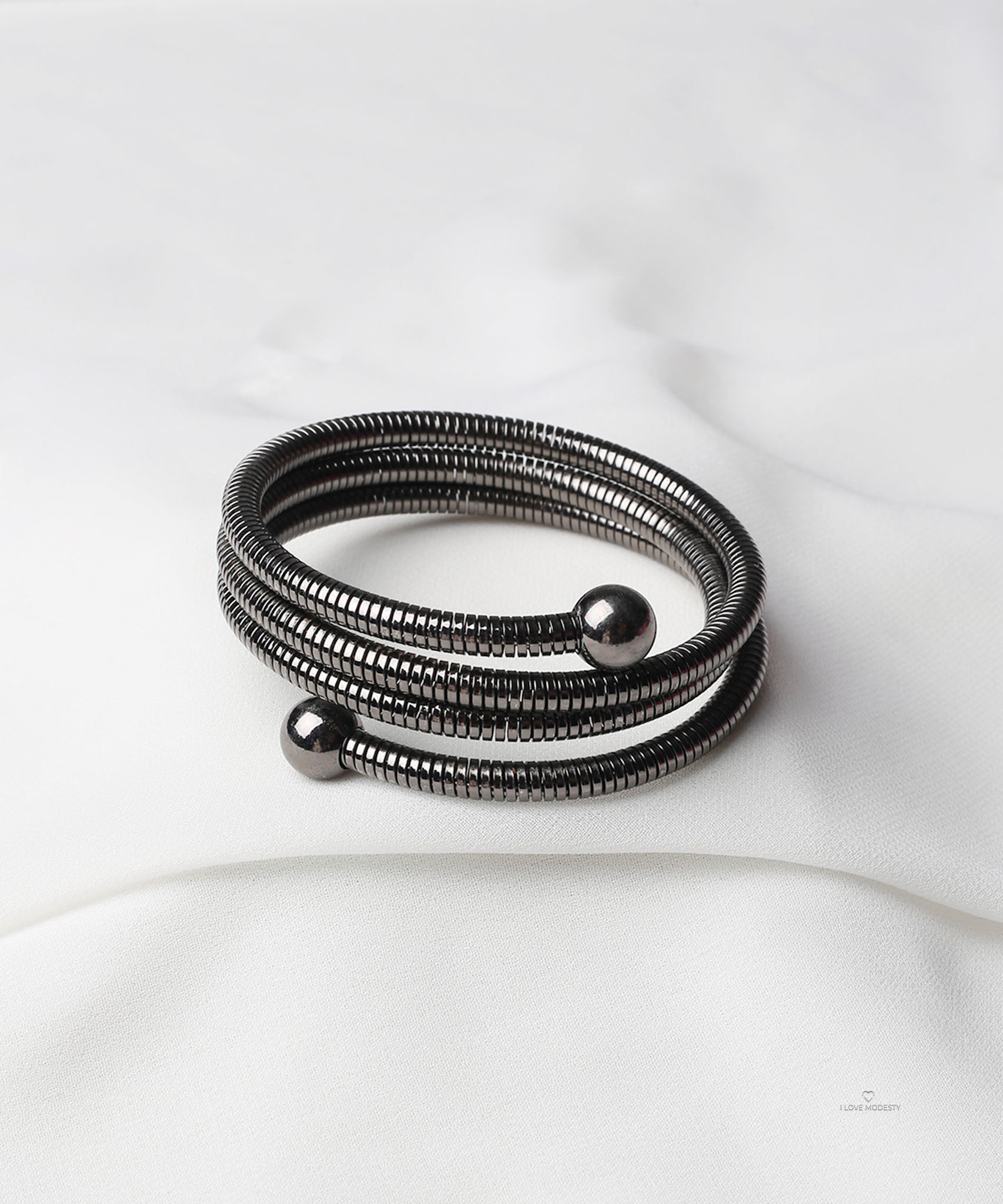 This Platinum Black Coil Wrap Bracelet is crafted with a flexible snake-style coil, finished with polished tips for a sleek touch. The wraparound design curves around the wrist. Ideal for both casual to workwear looks.