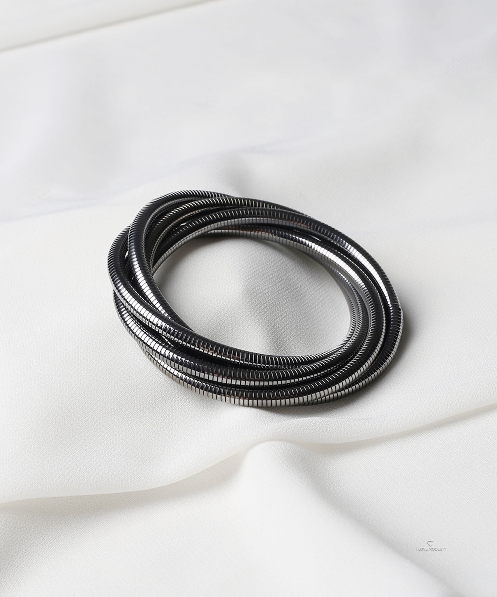 This Platinum Black Layered Snake Chain Coil Bracelet features multiple metallic coils with a smooth, serpentine texture. Lightweight yet bold. Perfect for formal events, or modern festive styling.