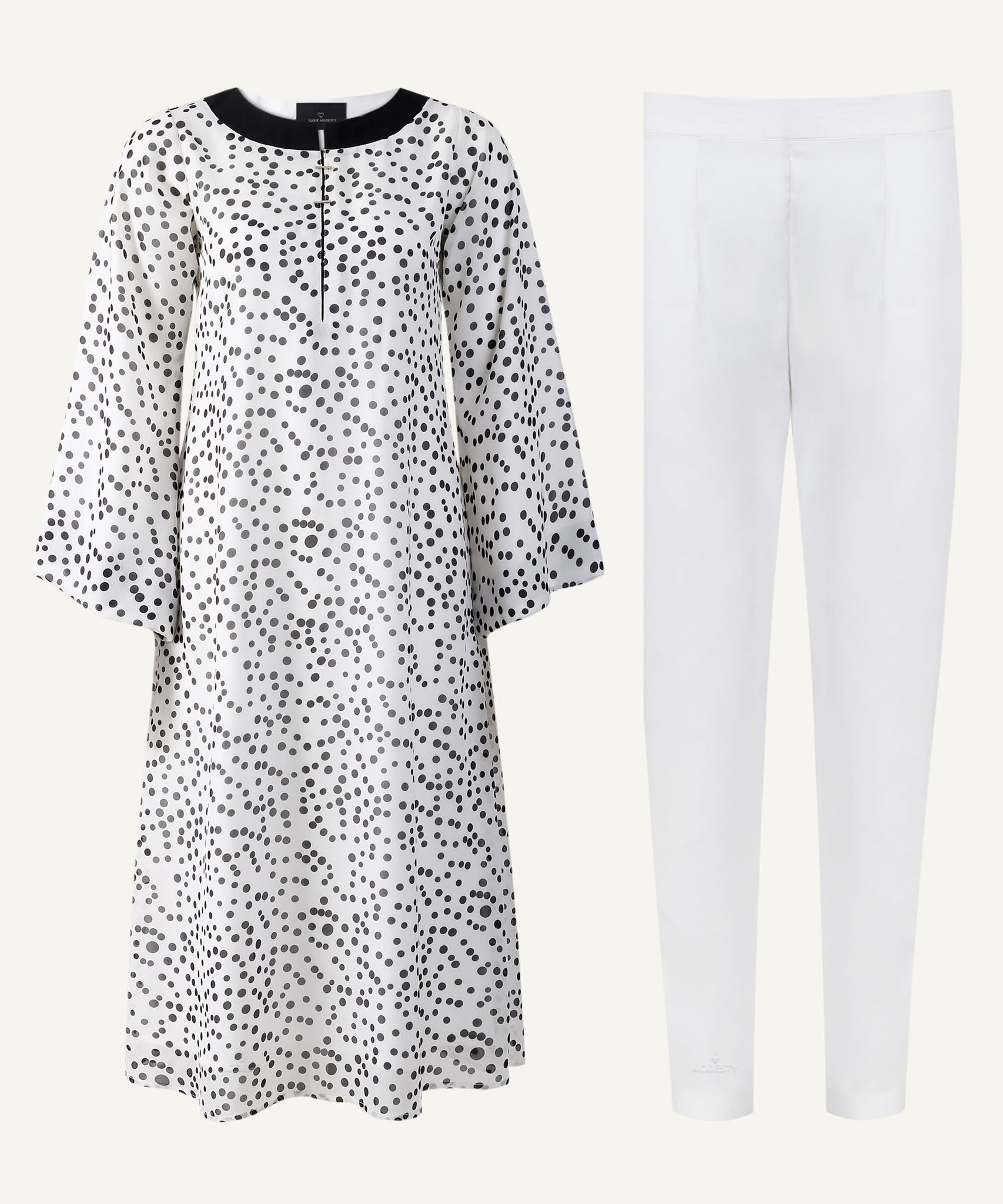 This Polka Dot Contrast Neck Midi-Length Matching Set is crafted from lightweight chiffon fabric, it offers a graceful flow and comfort. Featuring bell sleeve, a round contrast neckline, and button detailing on neck. The set includes elastic waist trousers for a comfortable fit.