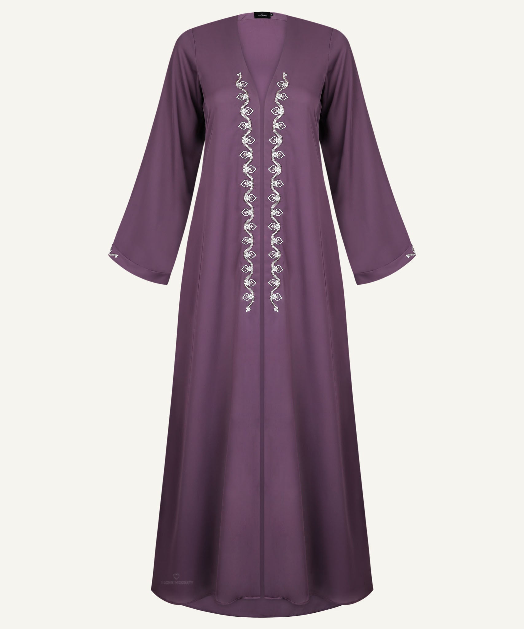 This Purple Open Front Cardigan Abaya is crafted from soft georgette in a front-open design, adorned with handcrafted embellishments on both panels. The roll-up sleeves are subtly detailed with minimal embellishment, making it a graceful choice for weddings, formal events, and elegant evenings.