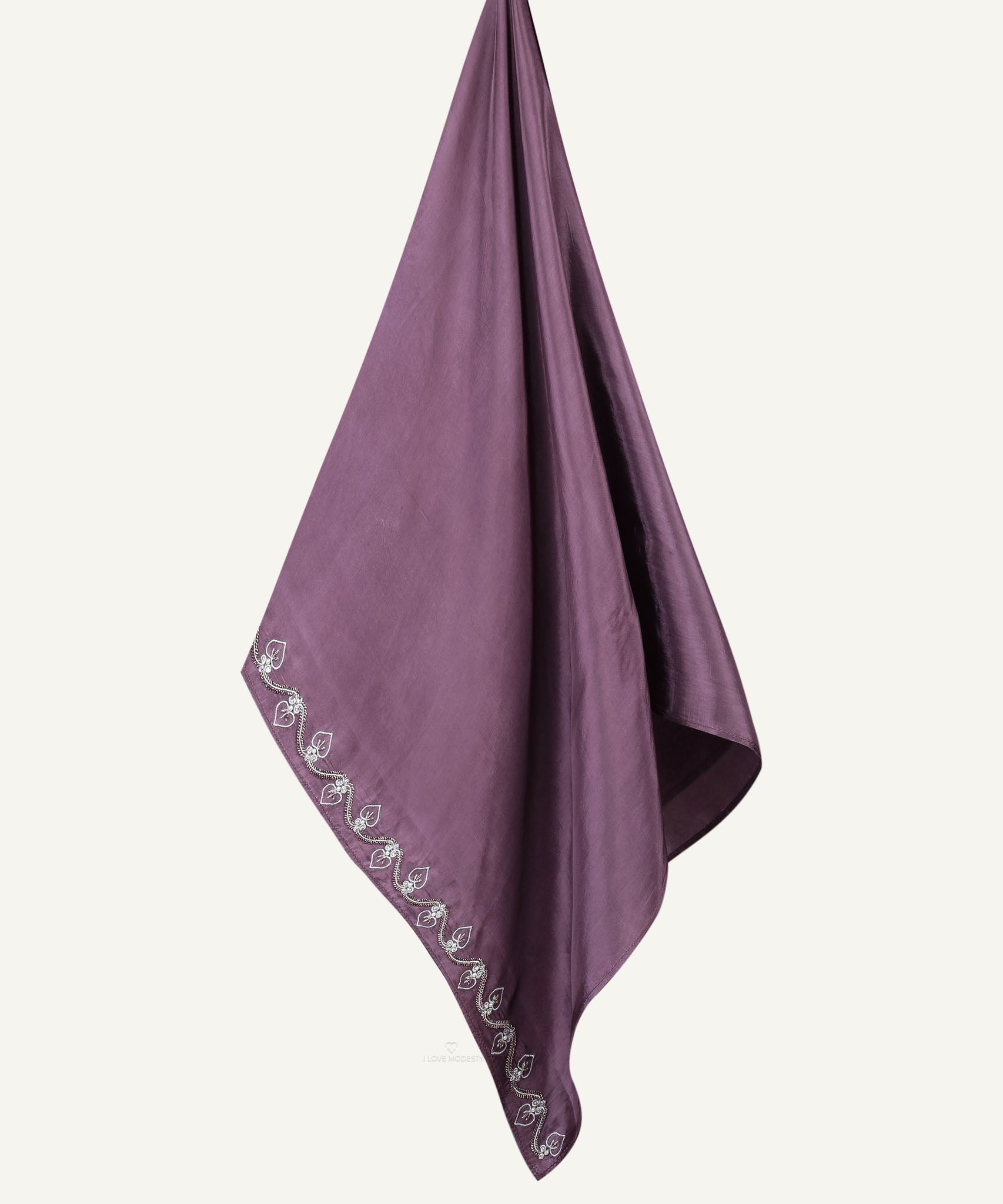 The Purple Satin Fancy Hijab, crafted from soft satin fabric that drapes gracefully with a rich sheen, showcases embroidered borders with handcrafted embellishments, making it perfect for weddings and festive occasions.