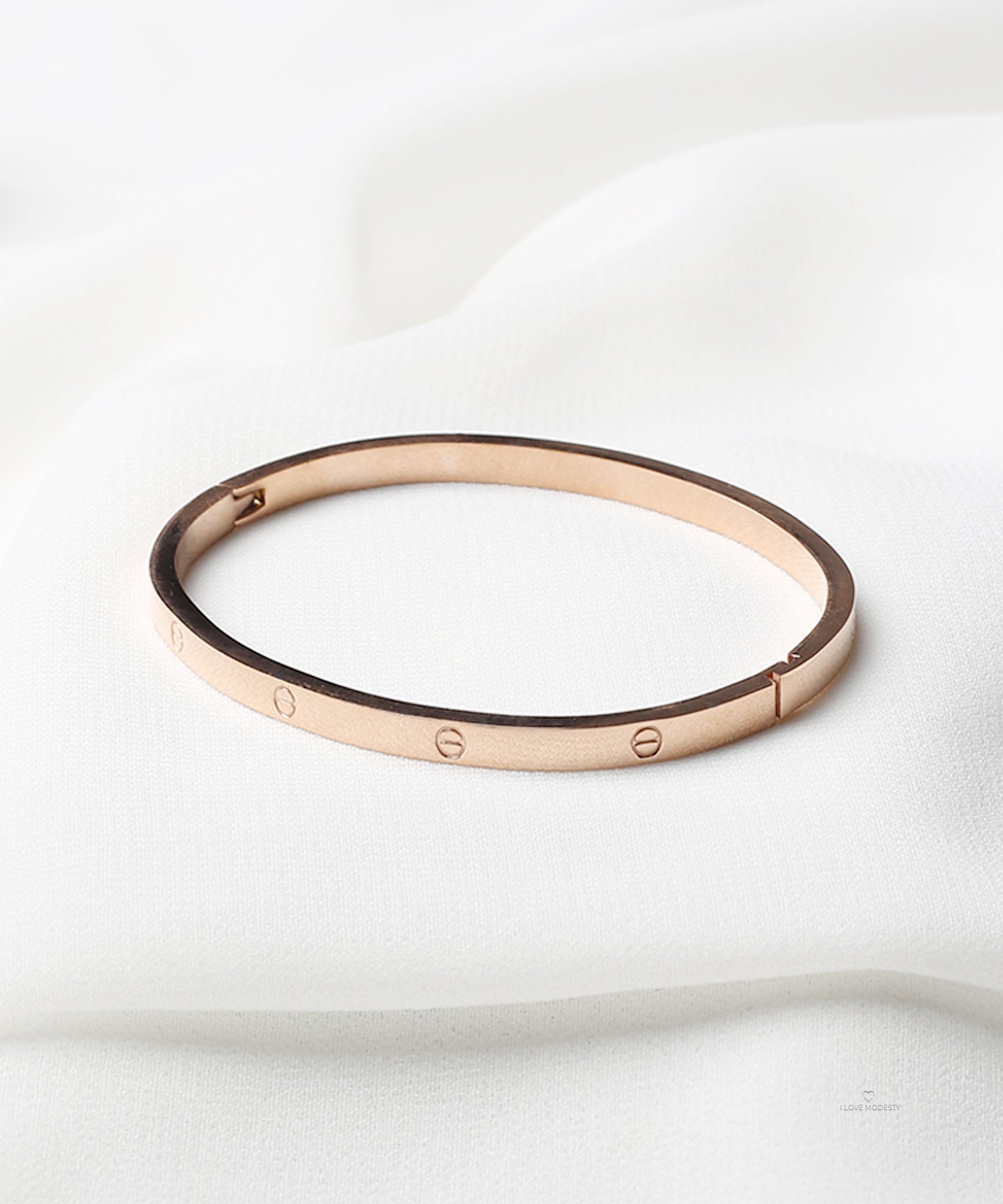 This Rose Gold Screw Detail Bracelet features a slim, sleek band adorned with subtle screw-like engravings. Perfect for everyday wear.