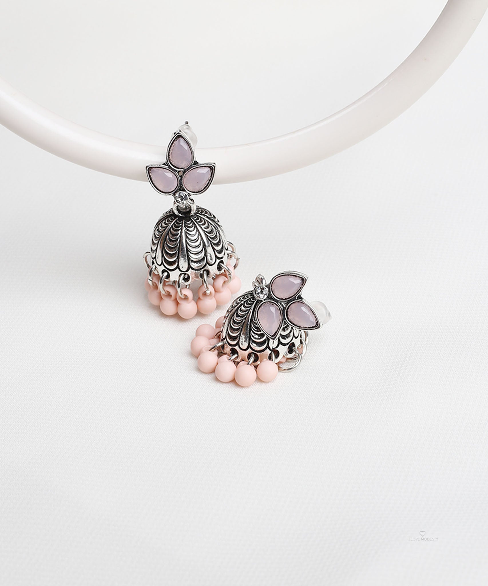 These Rose Water Beads Silver Stud Jhumka Earrings blend tradition with minimalism. Featuring intricate detailing on a dome and delicate beads, they complement both traditional and modern outfits perfect for weddings, festive occasions, or adding subtle elegance to everyday looks.