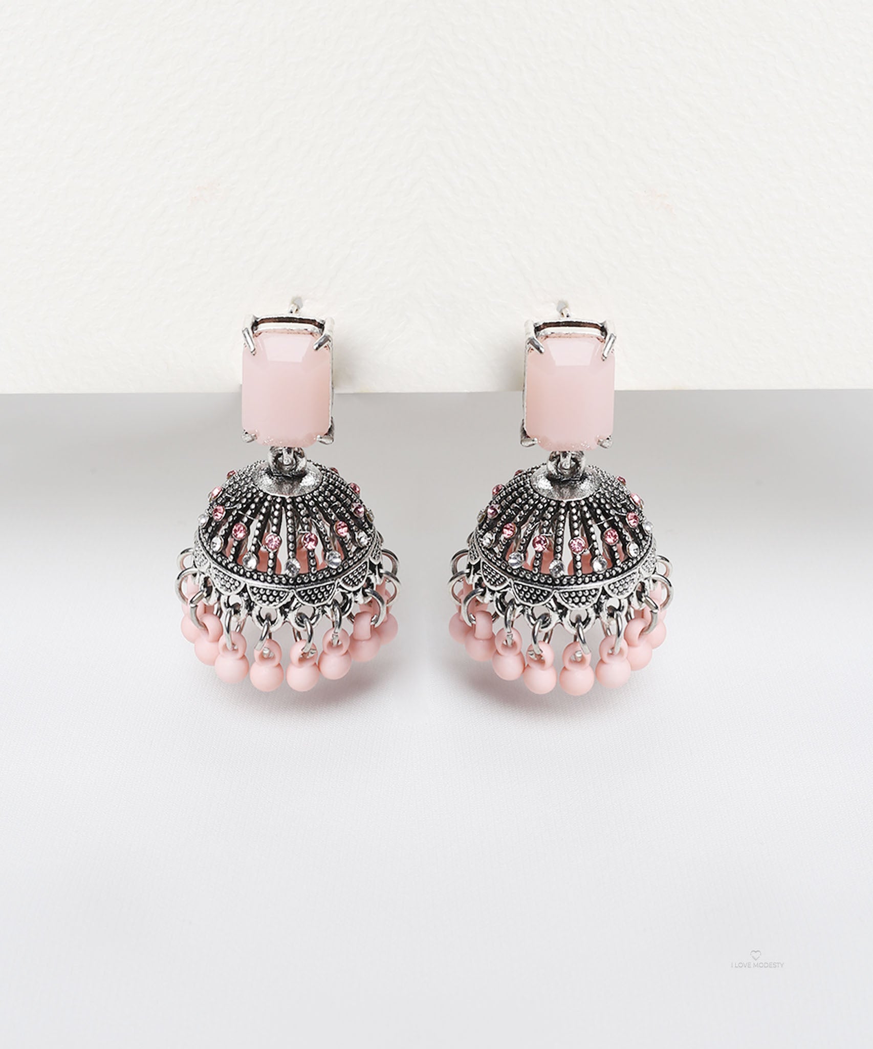 These Rose Water Stone Silver Stud Jhumka Earrings blend tradition with minimalism. Featuring intricate detailing on a dome and delicate beads, they complement both traditional and modern outfits perfect for weddings, festive occasions, or adding subtle elegance to everyday looks.