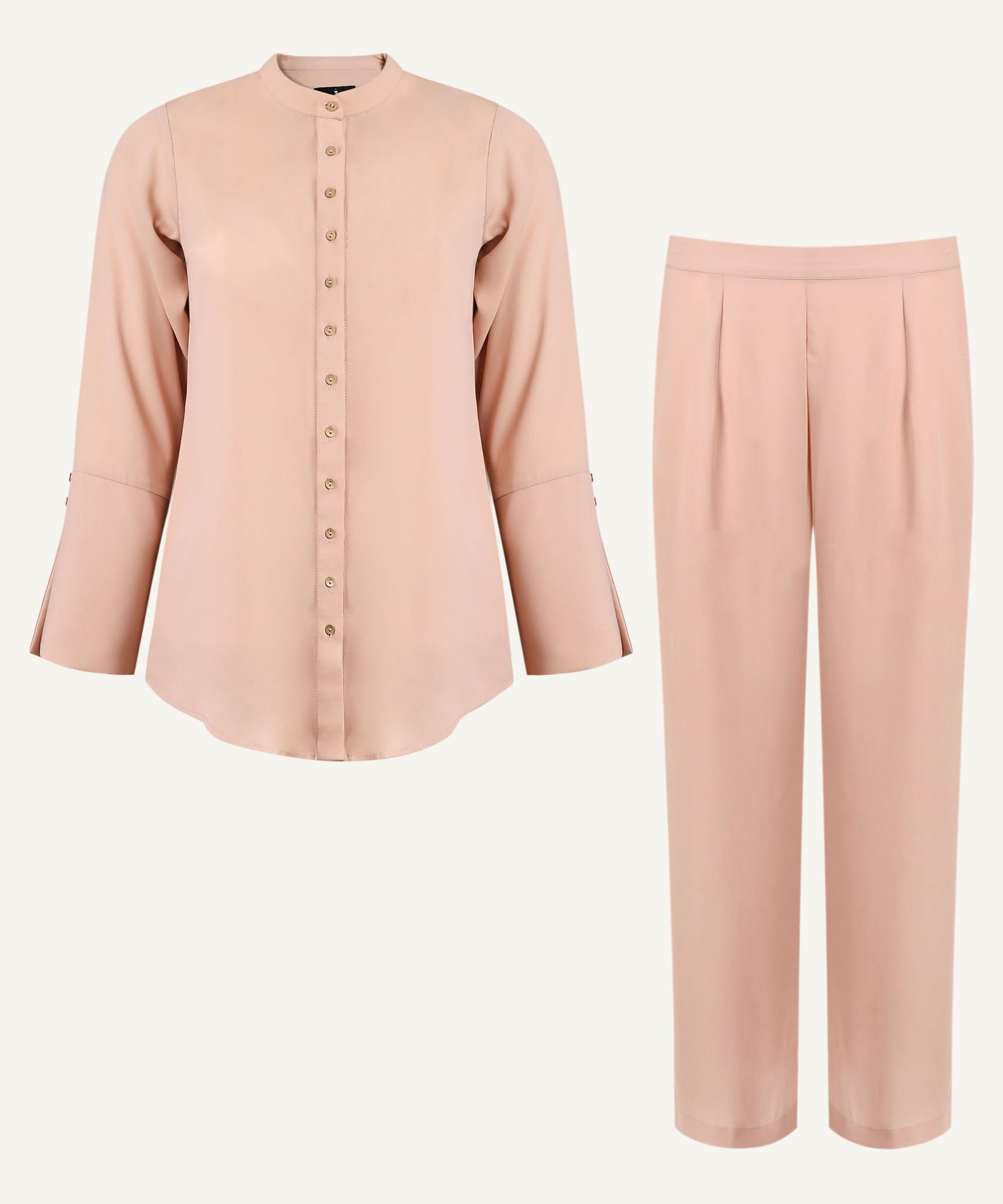 This Sand Strom Button Down Matching Set is crafted from soft and lightweight georgette fabric, the top features front button-down closure, and bell sleeves with button-detailed cuffs. Perfect for office wear, this set offers a refined yet comfortable look for everyday wear.