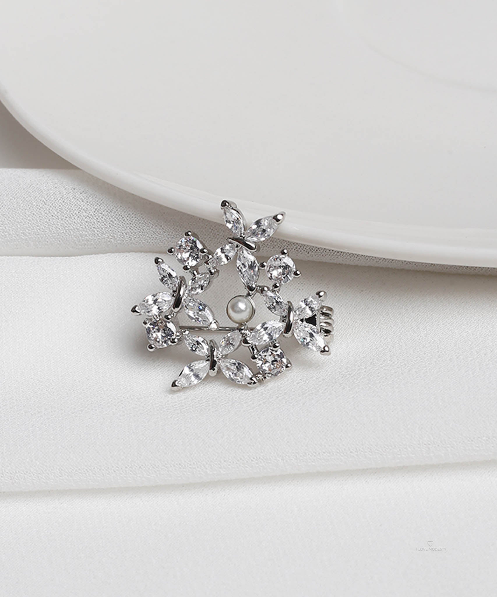 This Silver Crystal Bloom Brooch Pin designed with shimmering crystal petals and a delicate pearl center. The intricate arrangement adds a refined sparkle, perfect for formal outfits or elegant hijab styling.