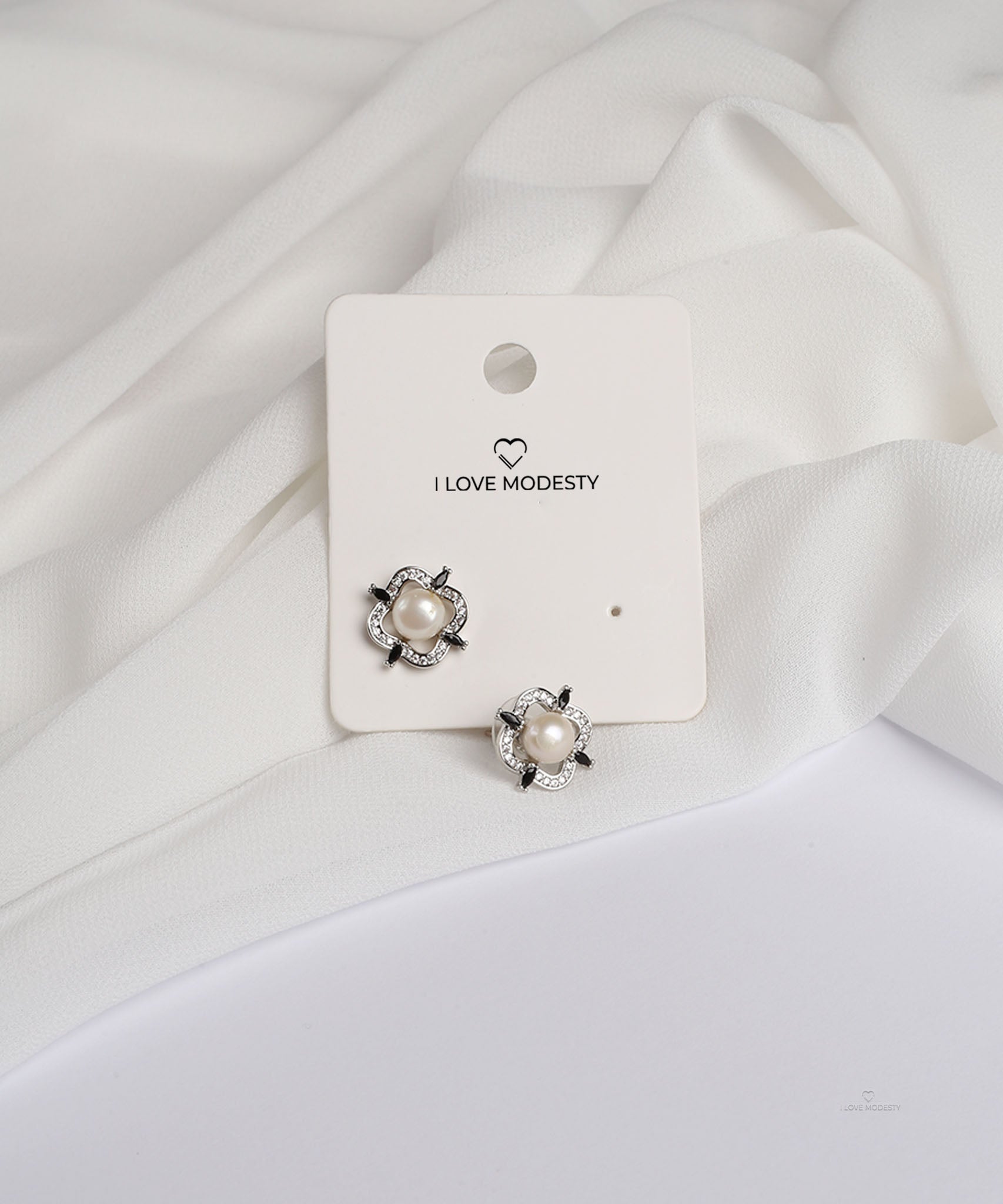 These Silver Ivory Petal Pearl Stud Earrings feature an ivory-white pearl at the center, framed by a sparkling pave halo and accented with subtle black enamel tips. Perfect for everyday wear or adding a touch of charm to formal looks.