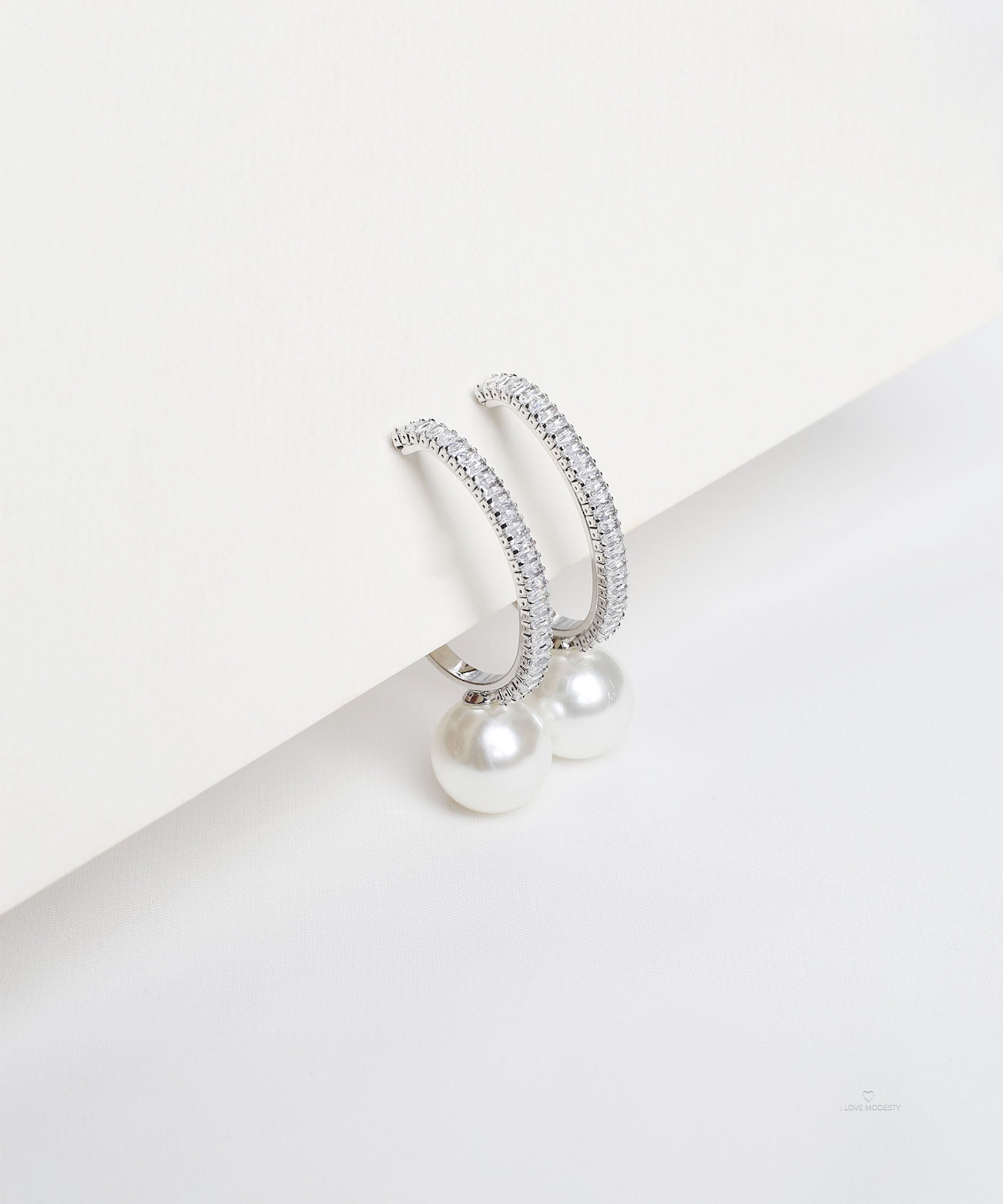 These Silver Pave Hoop Pearl Earrings feature a curved pave-set hoop adorned with fine crystals, ending in a lustrous round pearl drop. A refined design that adds sparkle to formal and evening wear.
