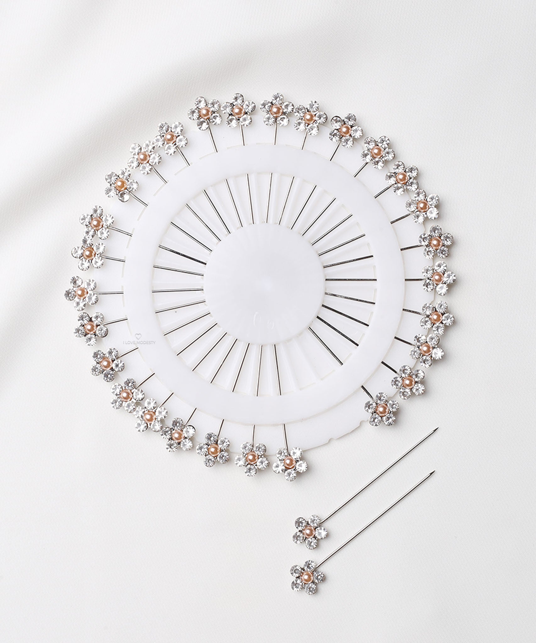 These Silver Rhinestone with Rose Gold Pearl Flower Head Hijab Pins are crafted from steel and come neatly arranged in a compact storage wheel, making them easy to use and store.