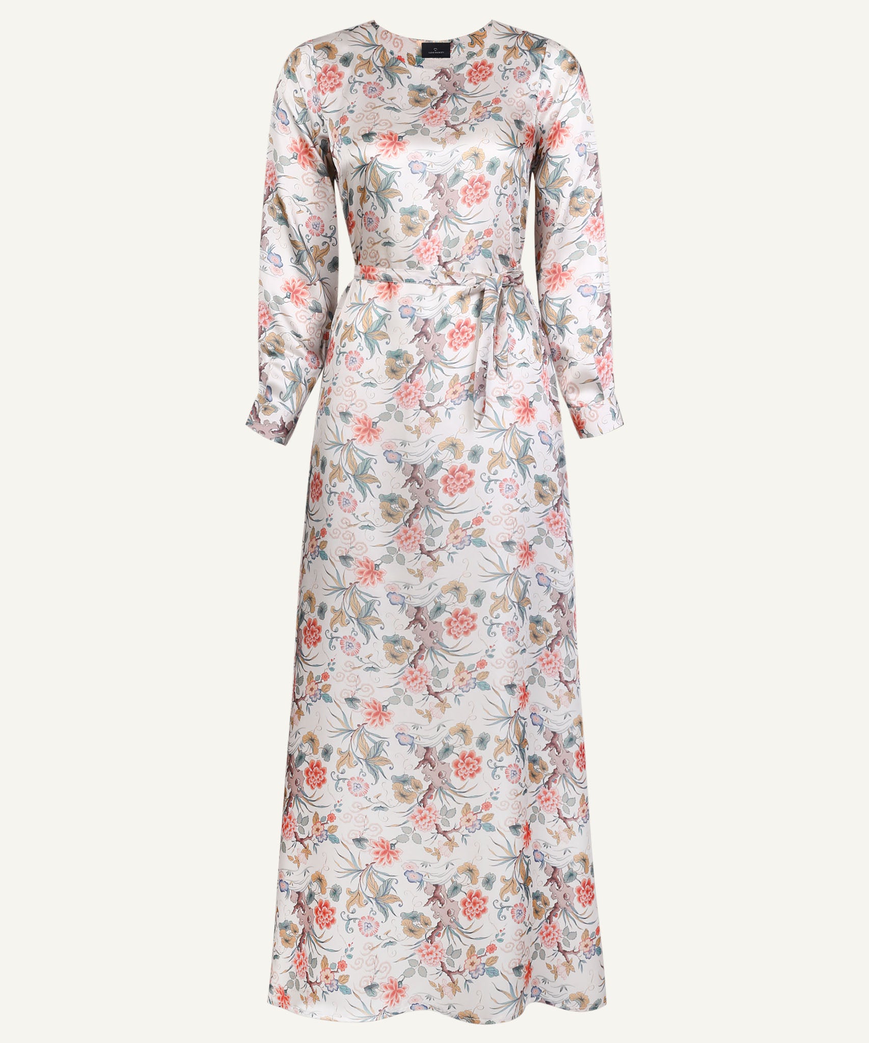 The Soft Beige Printed Maxi Dress is crafted from soft and lightweight satin fabric. Featuring a smooth drape and delicate floral print. Perfect for both casual and semi-formal occasions.