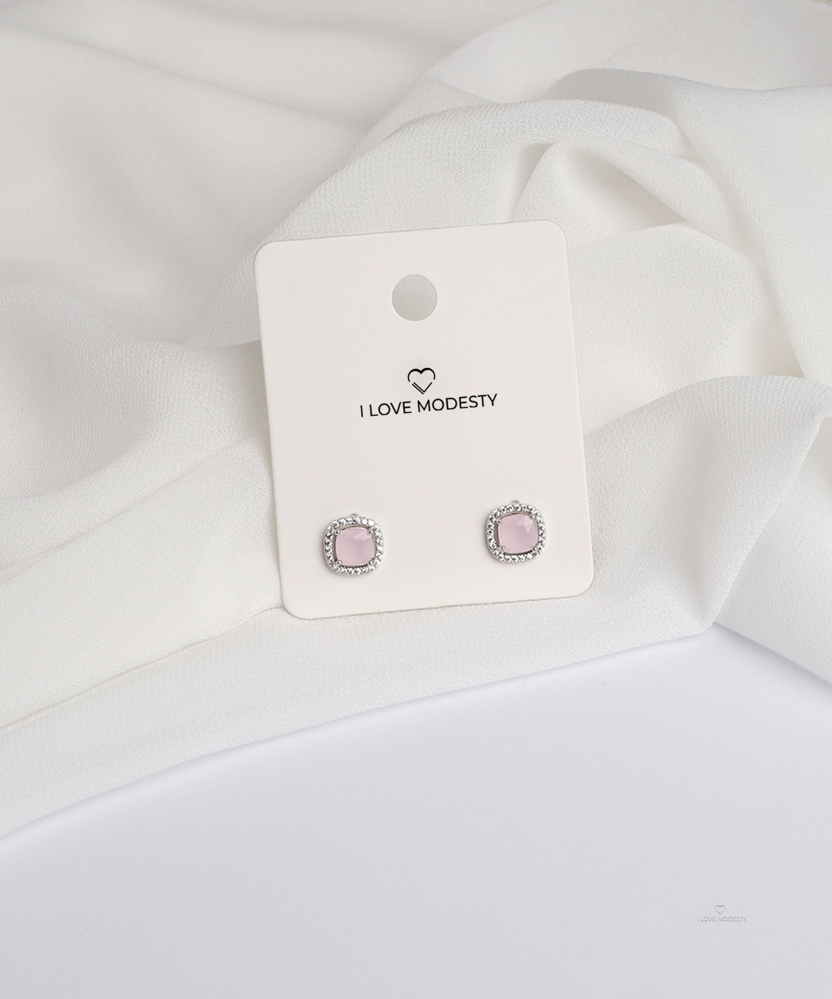 These Soft Pink Square Stud Earrings feature a soft pink quartz stone in a silver-plated frame encrusted with clear pave crystals. Perfect for everyday wear or adding a touch of charm to formal looks.