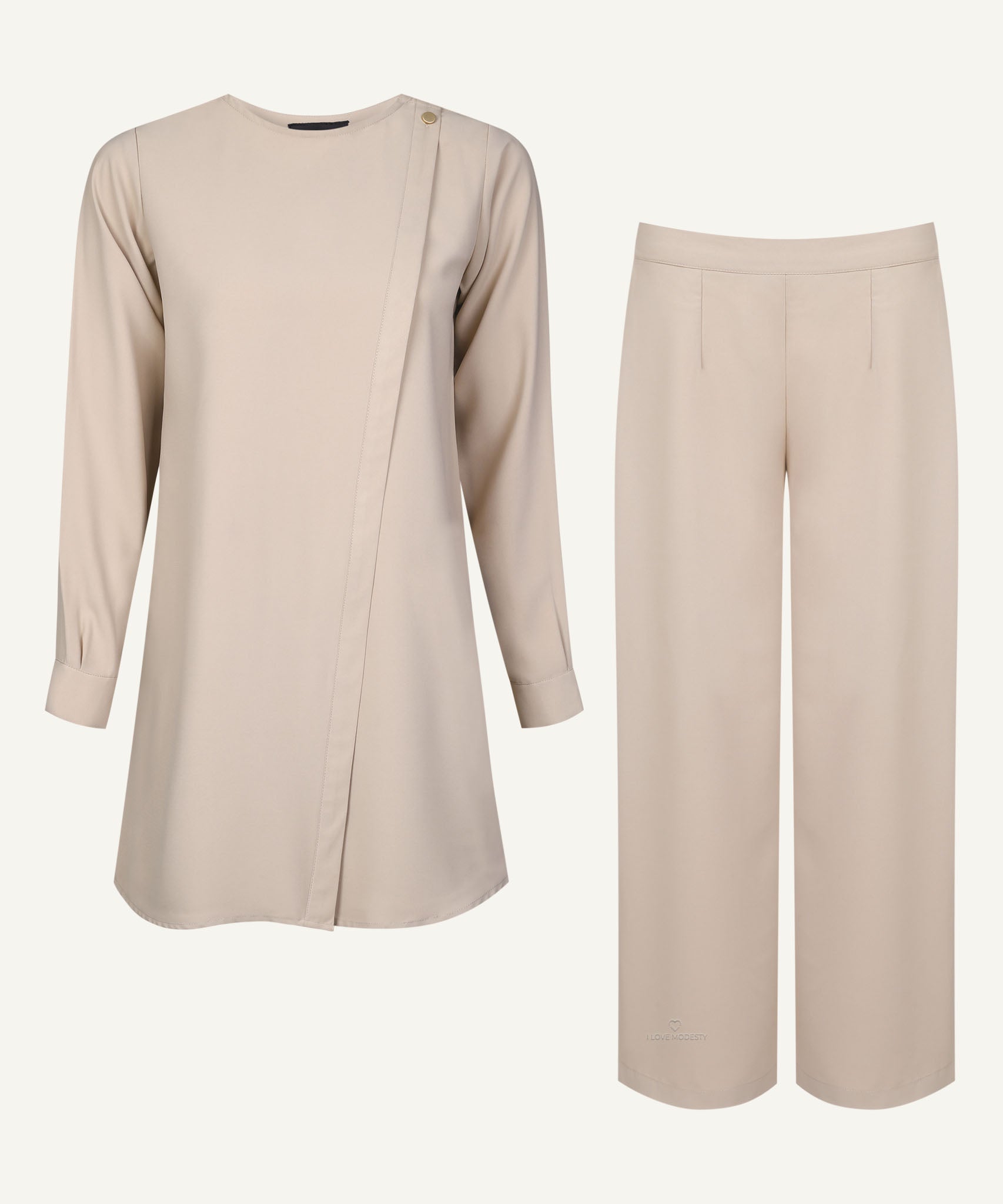This Warm Beige Side Placket Top Matching Set is crafted from a soft, breathable aerobin fabric, with a side panel and shoulder button detail. With a straight, flowy design is perfect for casual and office wear the set includes elastic waist trousers for a comfortable fit.