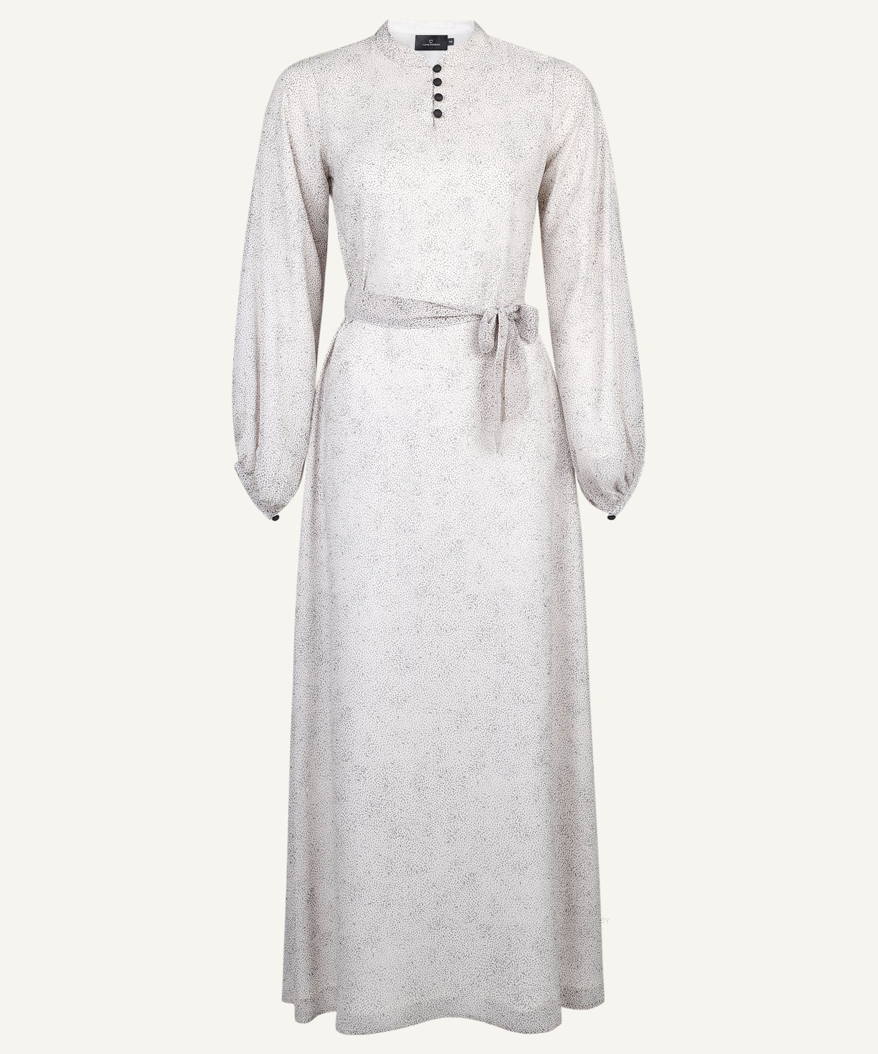 This White Micro Dotted Volume Sleeve A-Line Maxi Dress is crafted from lightweight chiffon fabric with an A-line silhouette. It features a band collar, a short front button placket, and sleeves with gathered buttoned cuffs. Suitable for casual wear, meetups, and daytime outings in mild to warm weather.