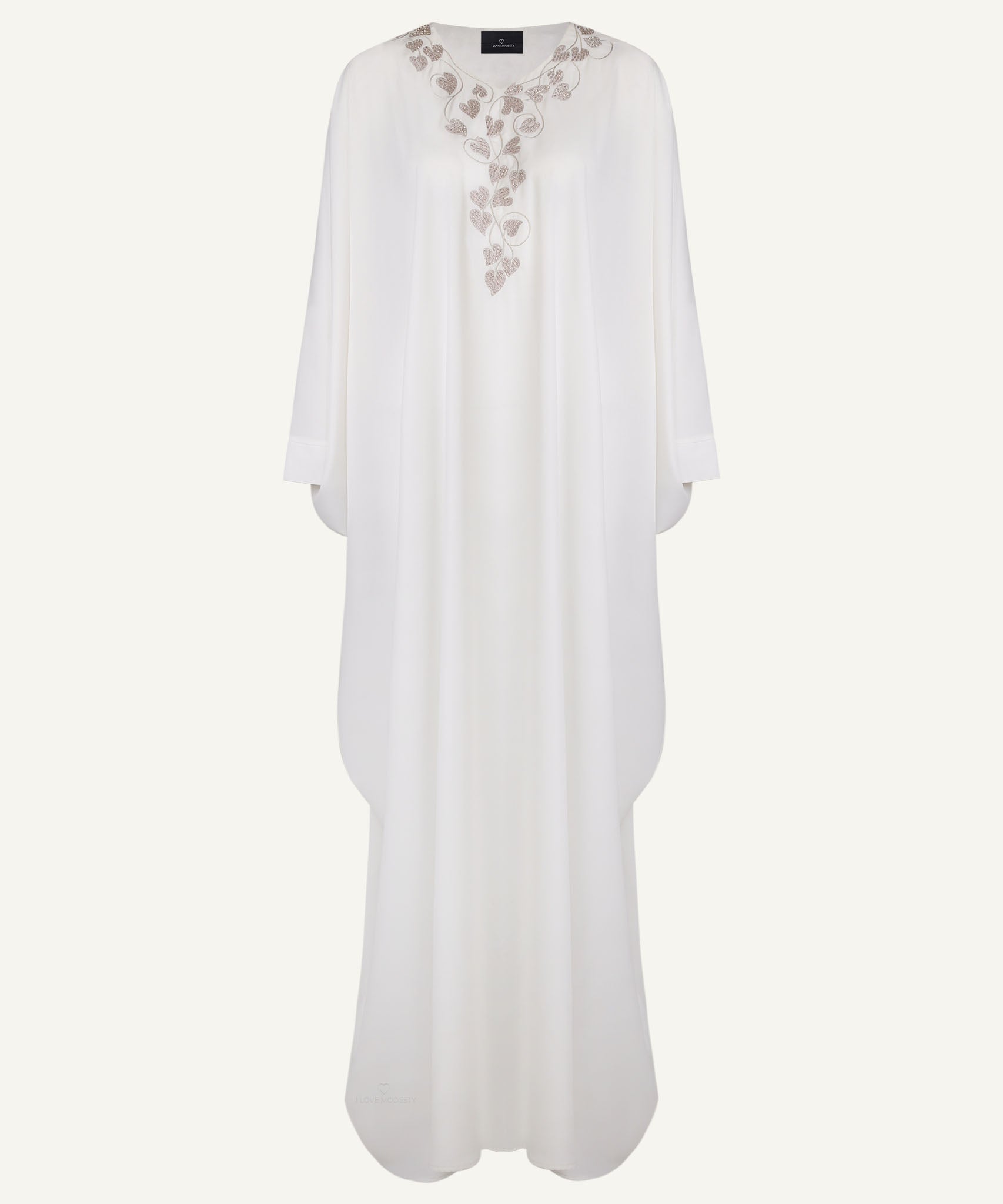 The White Noorelle Kaftan crafted from soft georgette, showcases an elegantly handcrafted embellished neckline. Its flowing silhouette brings a graceful charm, making it ideal for festive, evening events and special celebrations.