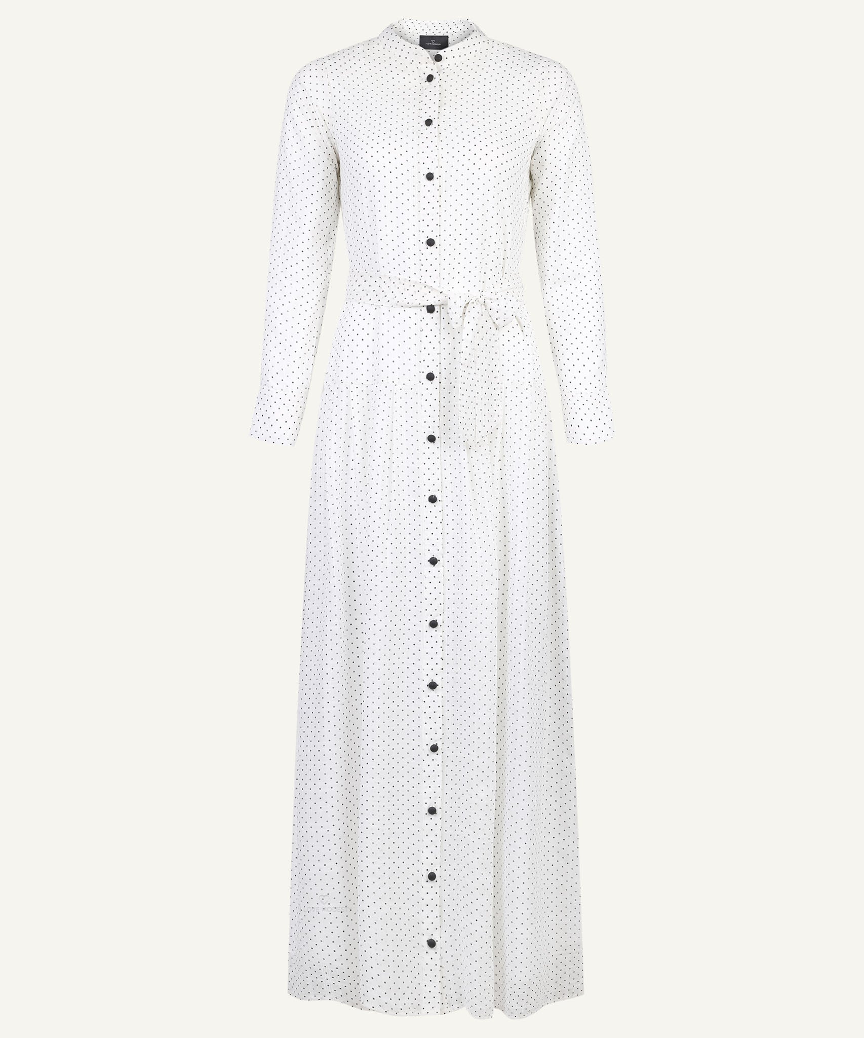 This White Polka Dot Button-Down Maxi Dress is crafted from lightweight georgette fabric with an A-line silhouette, featuring soft gathers at the waist and a button-down front. Suitable for casual outings and daytime gatherings in warm weather.