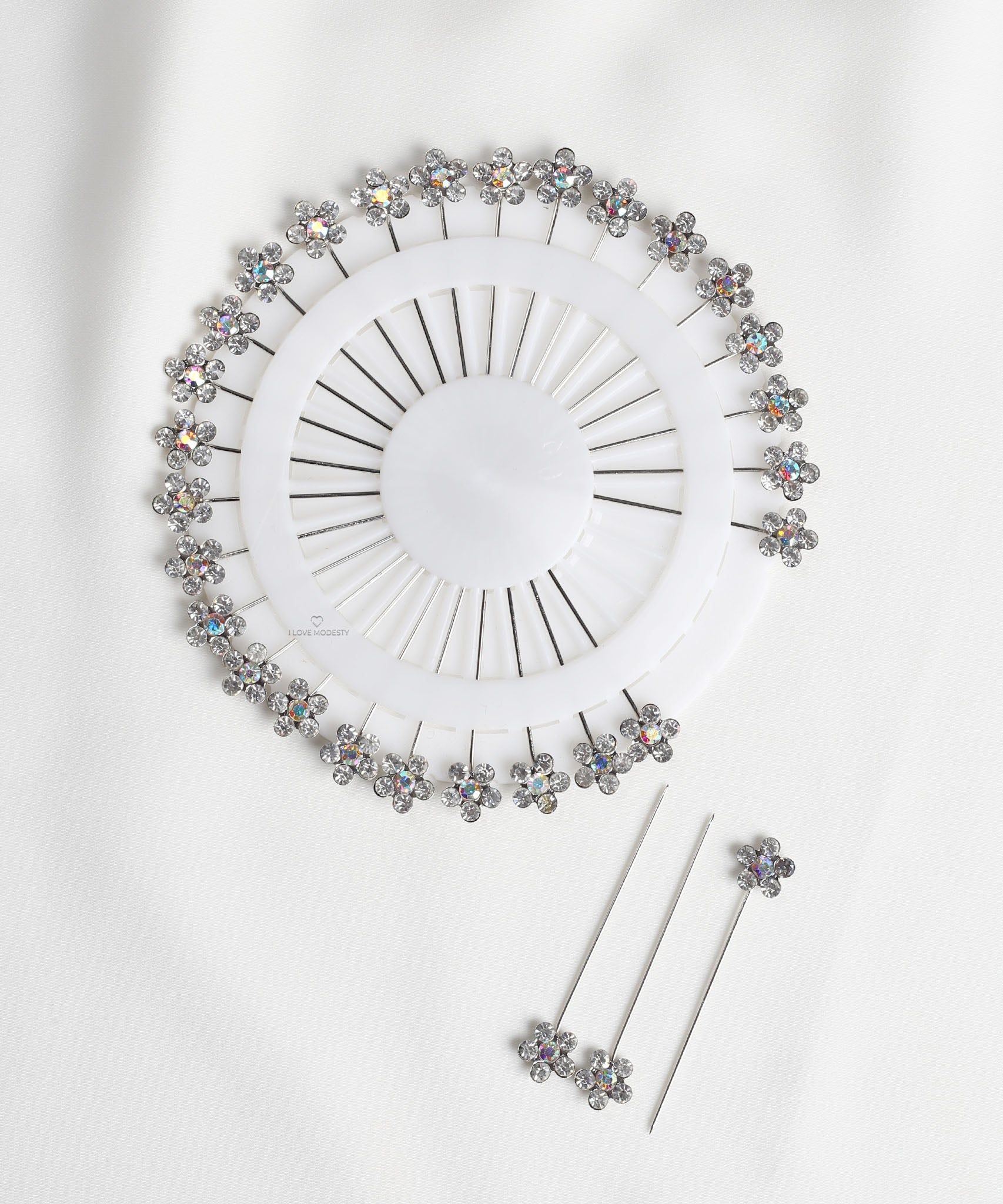 These White Rhinestone Flower Head Hijab Pins are crafted from steel and come neatly arranged in a compact storage wheel, making them easy to use and store.